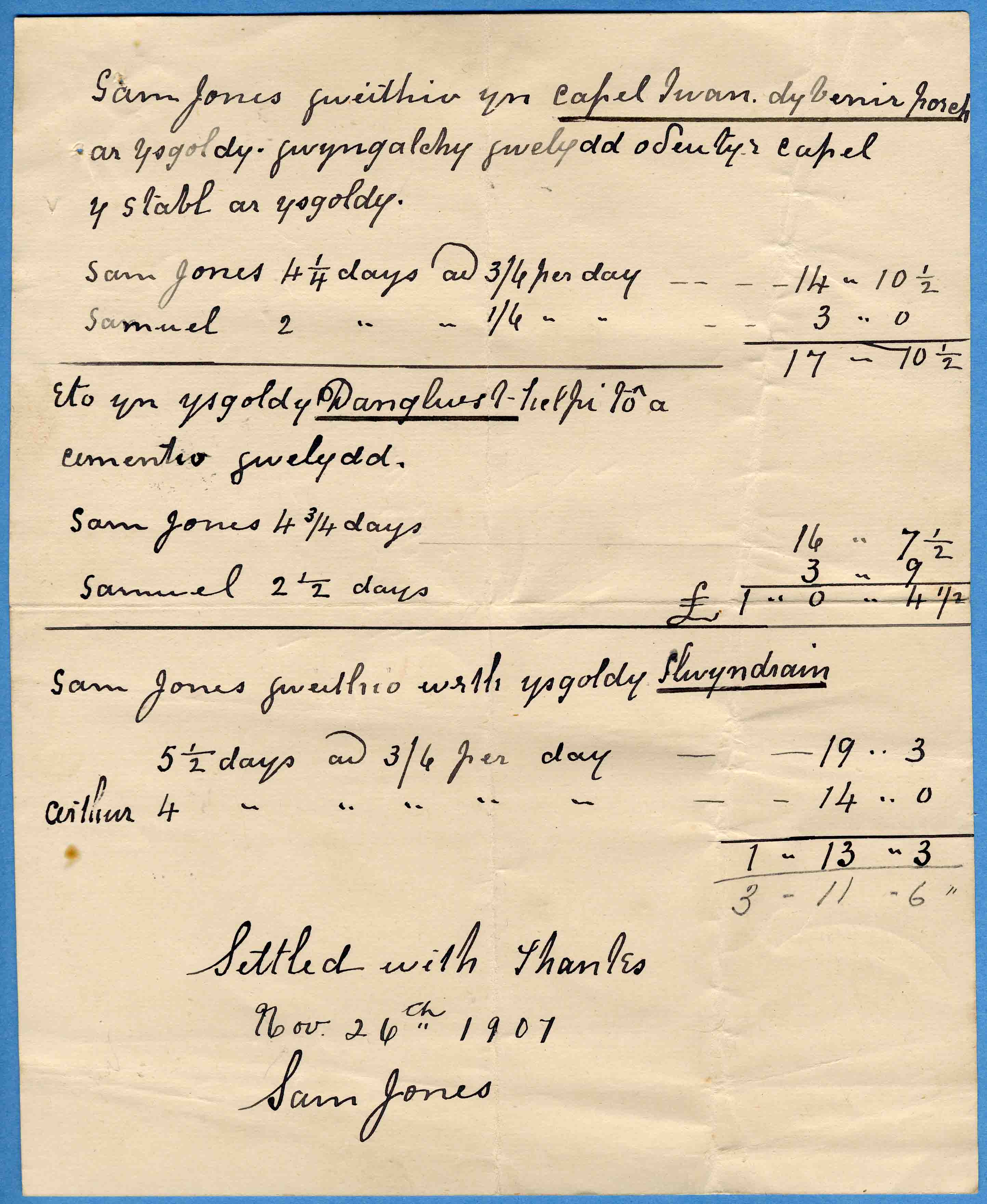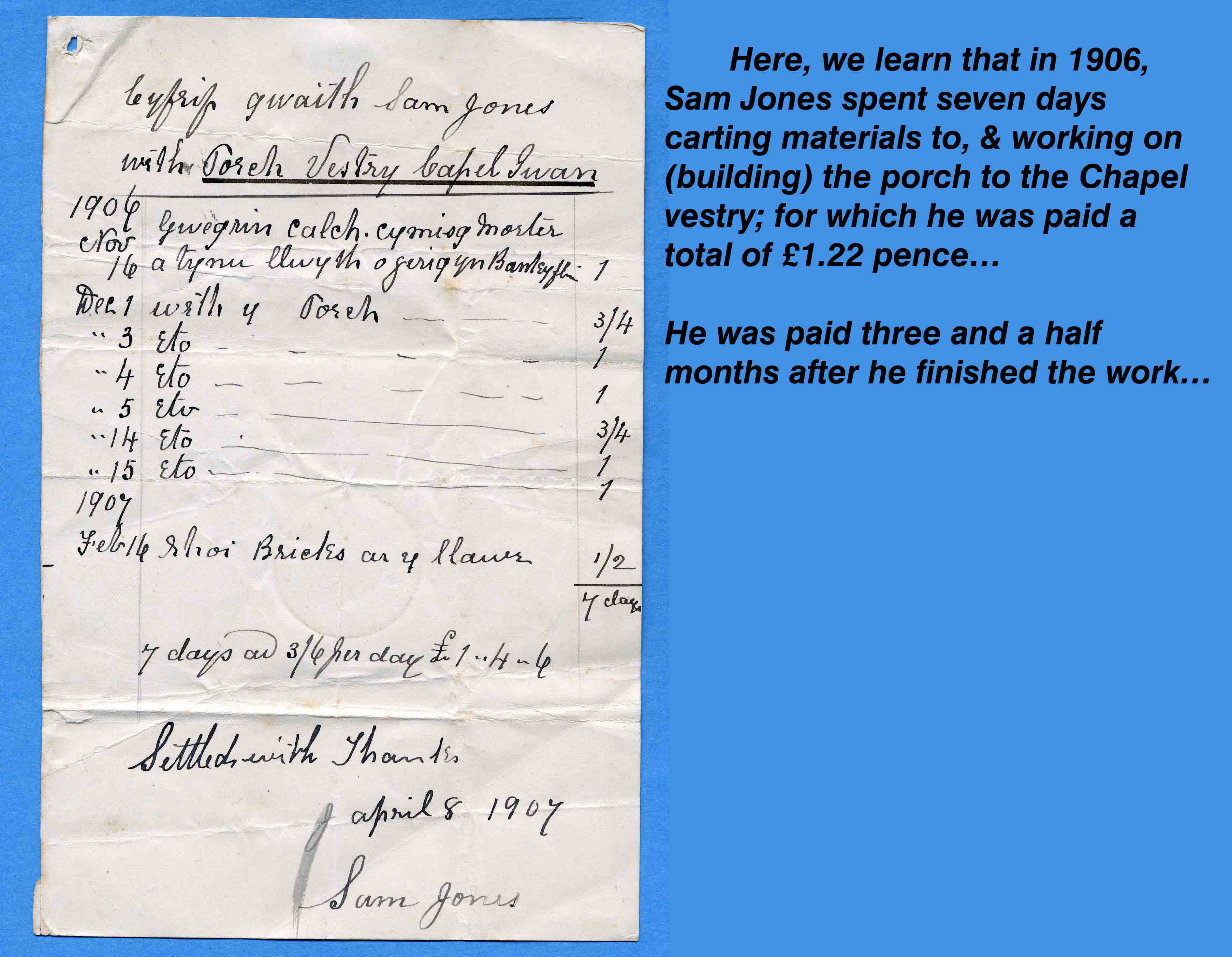 | November 1907 | Chapel Iwan Chapel | Sam Jones | 23 days labour on the vestry and stable at 3s 6d ( 2020 worth) per day | £3 11s 6d 2020 worth |