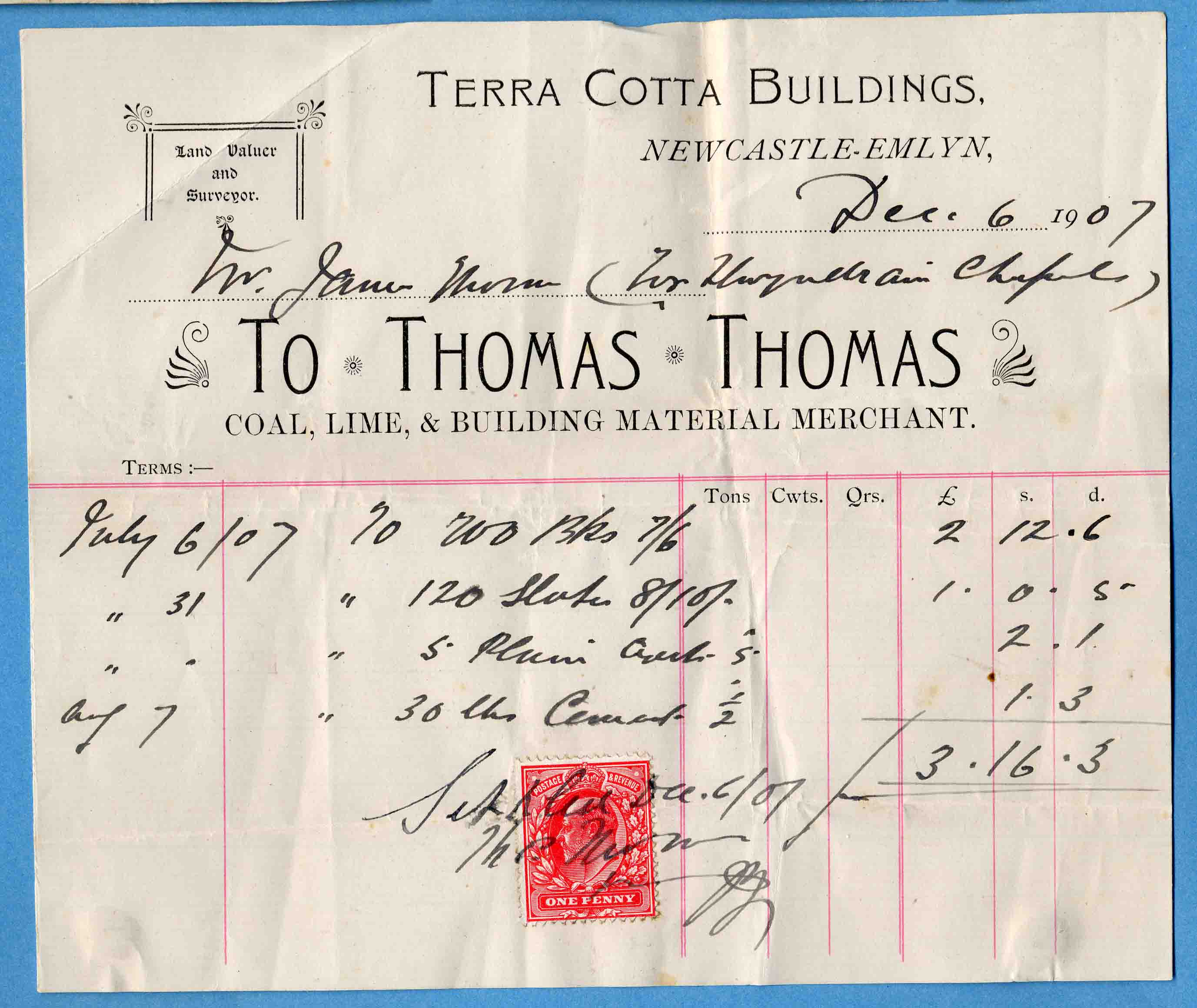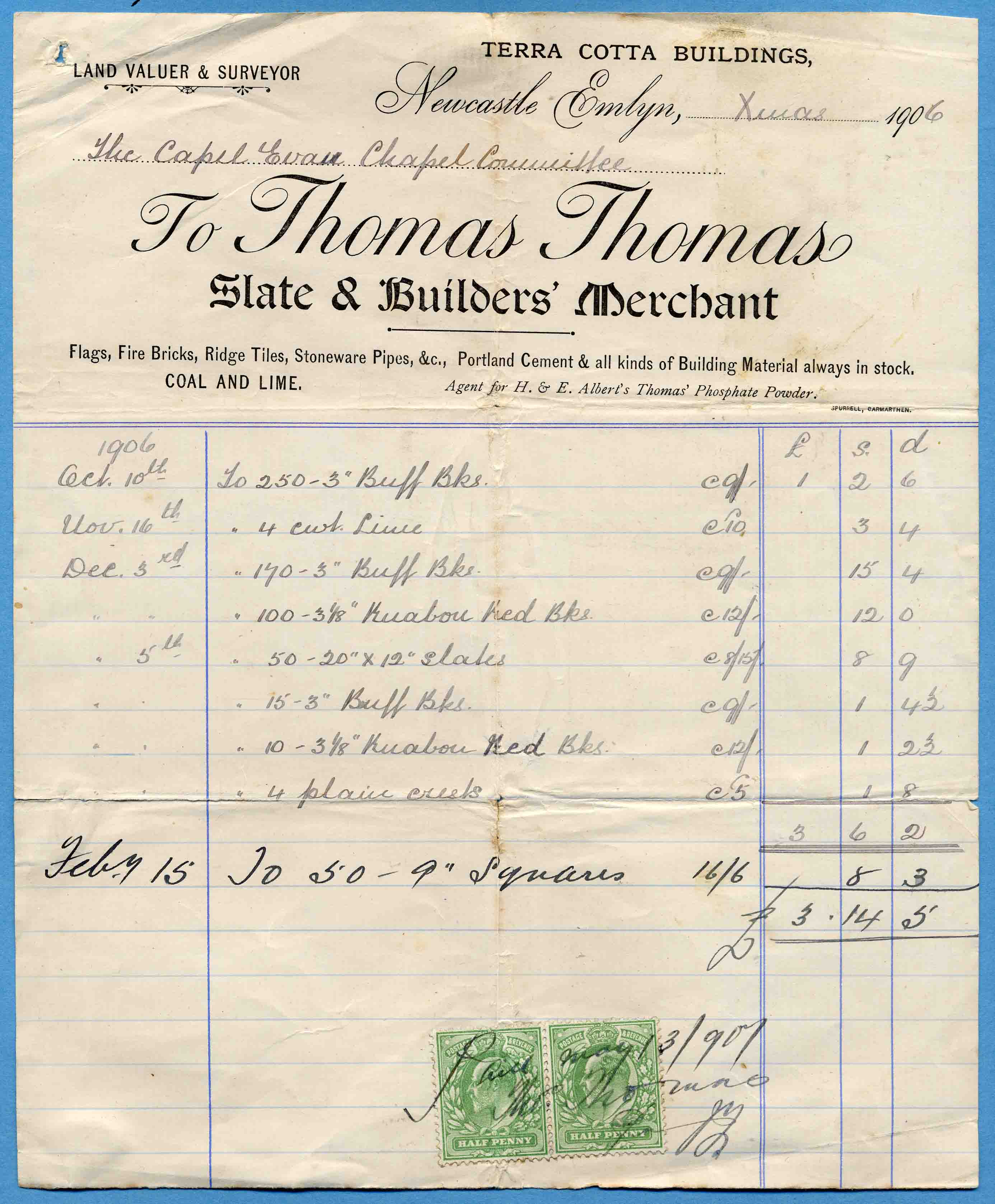 | 6th. December 1907 | (for Llwyndrain Chapel) | Thomas Thomas, Coal, lime & Building Material Merchant, Terra Cotta Buildings, Newcastle Emlyn |