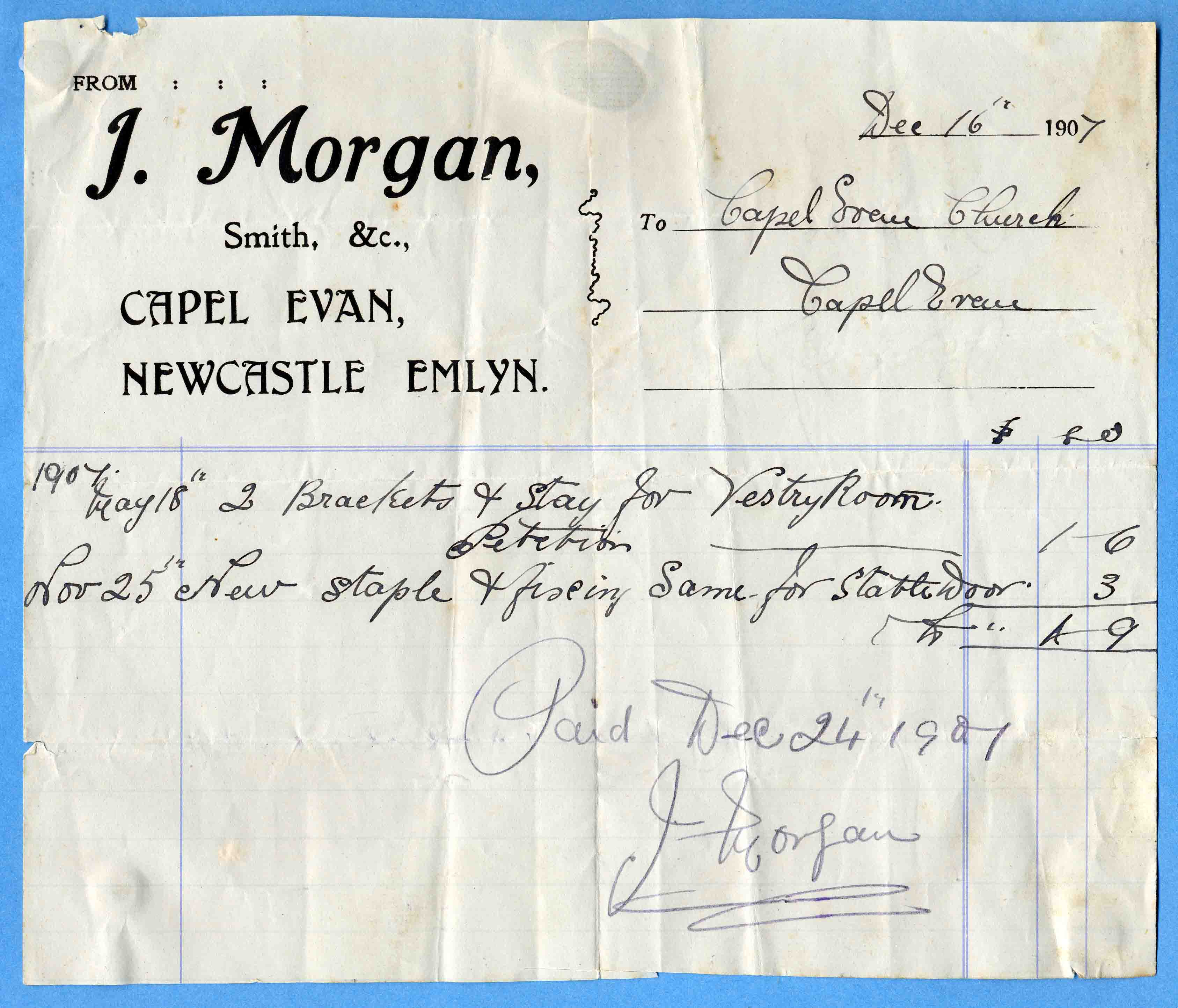 | 16th. December 1907 | Capel Evan Church | J. Morgan, Smith, &c., Capel Evan |