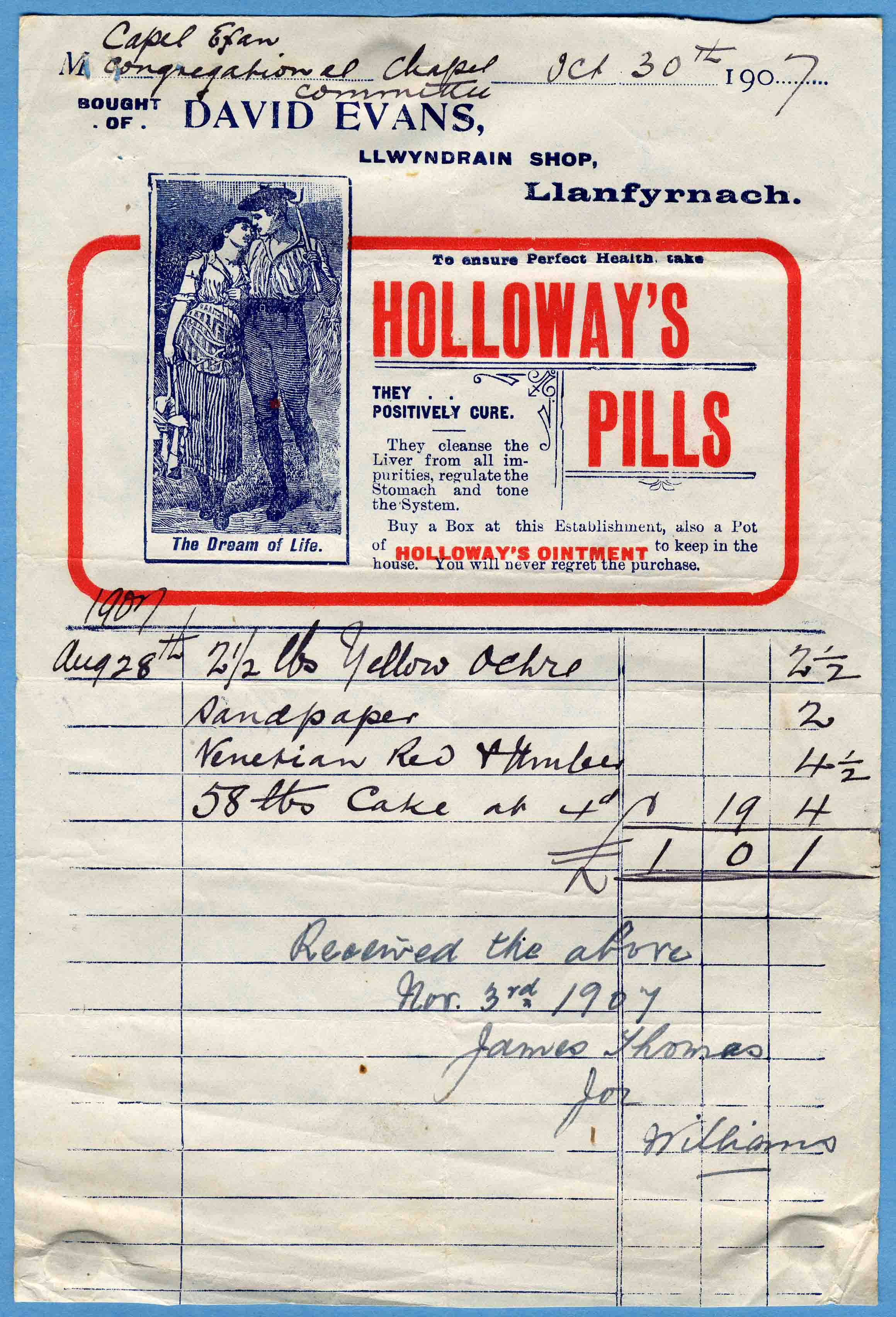 | 30th. October 1907 | Capel Efan Congregational Chapel Committee | David Evans, Llwyndrain Shop, Llanfyrnach |