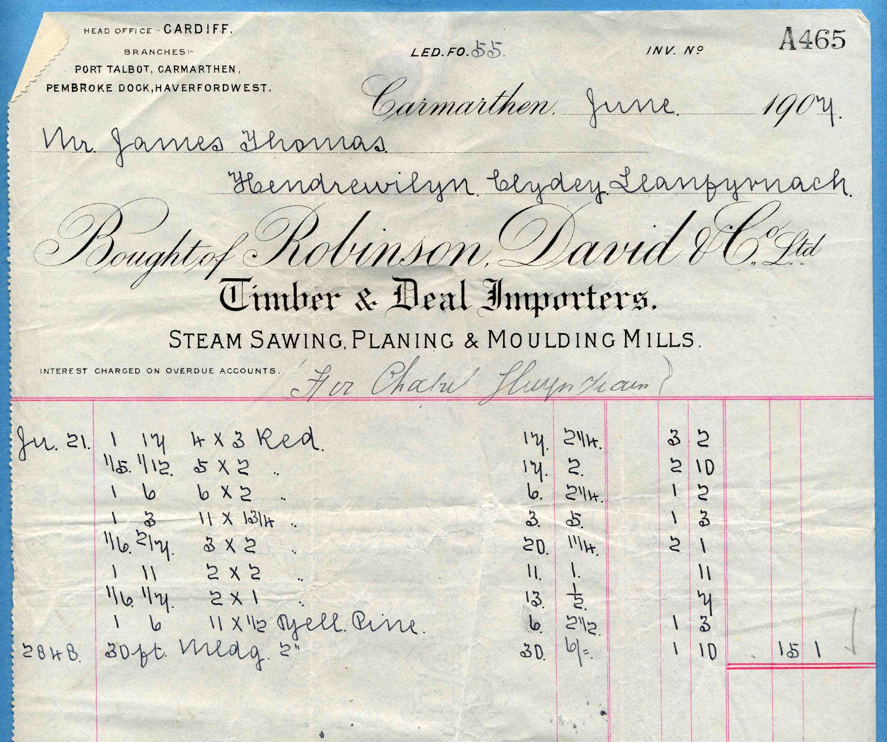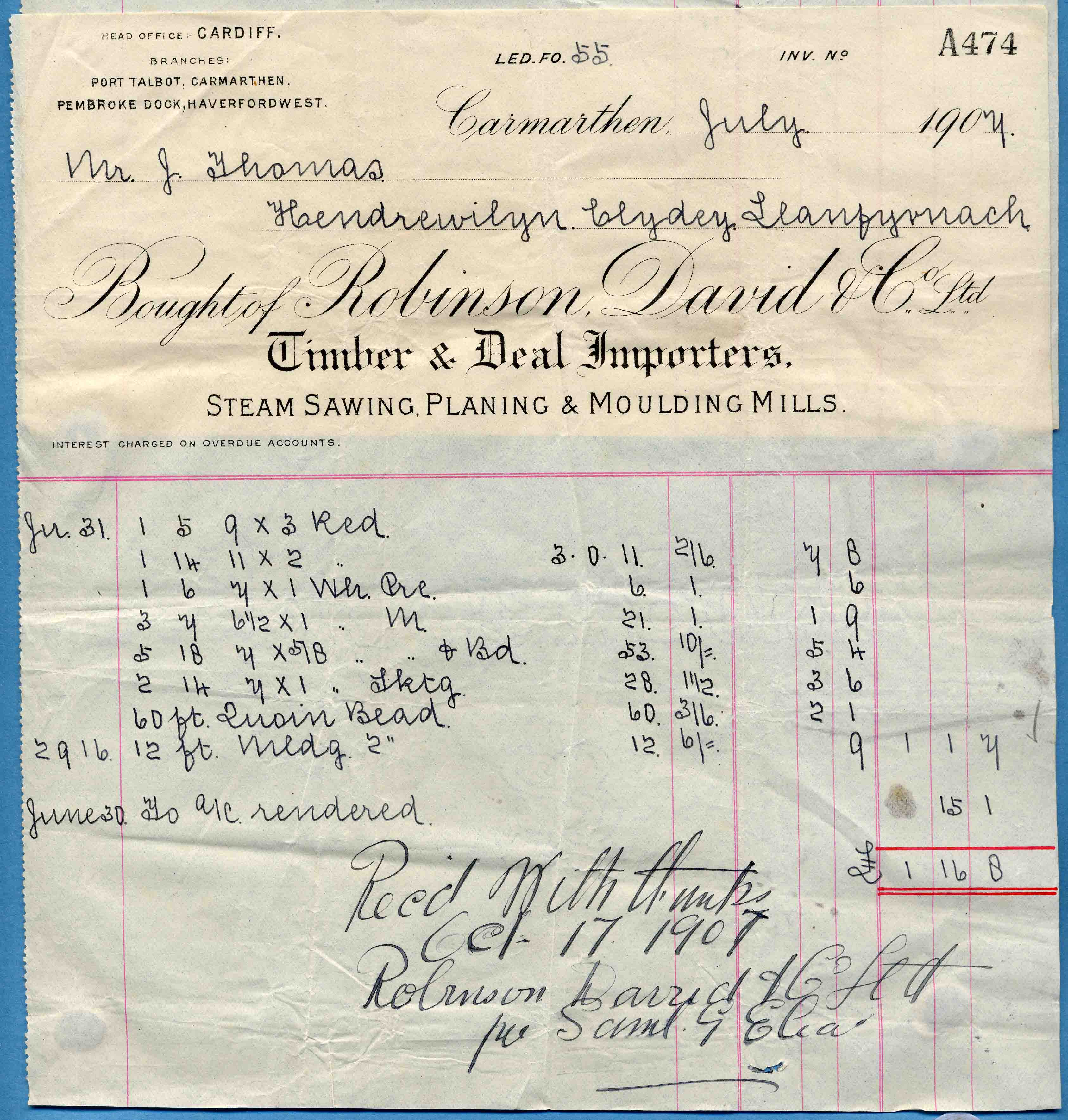 | July 1907 | Timber | £1 16s 8d | ||