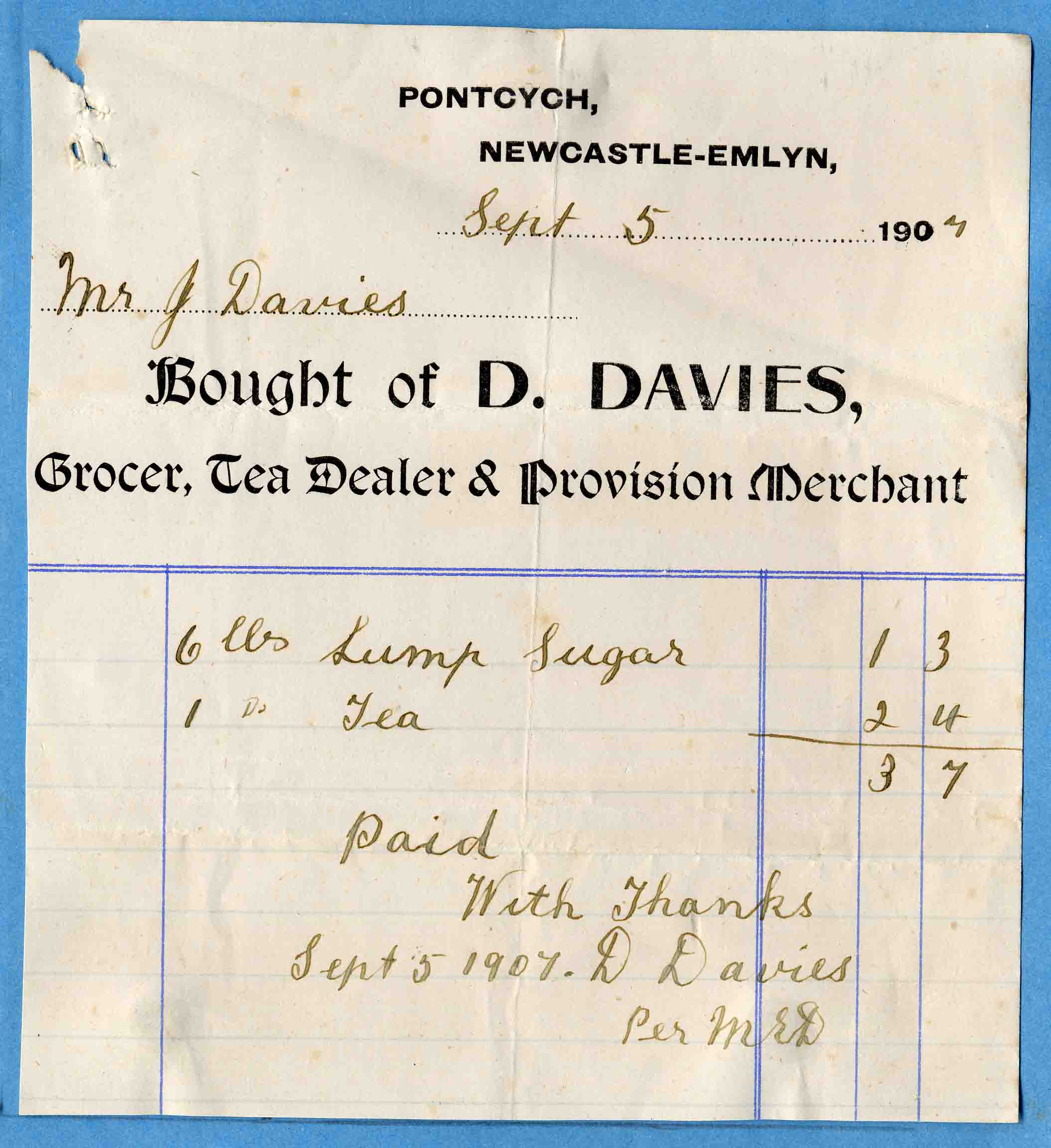 | 5th. September 1907 | Mr. J. Davies | D. Davies, Tea Dealer & Provision Merchant, Pontcych, Newcastle Emlyn |