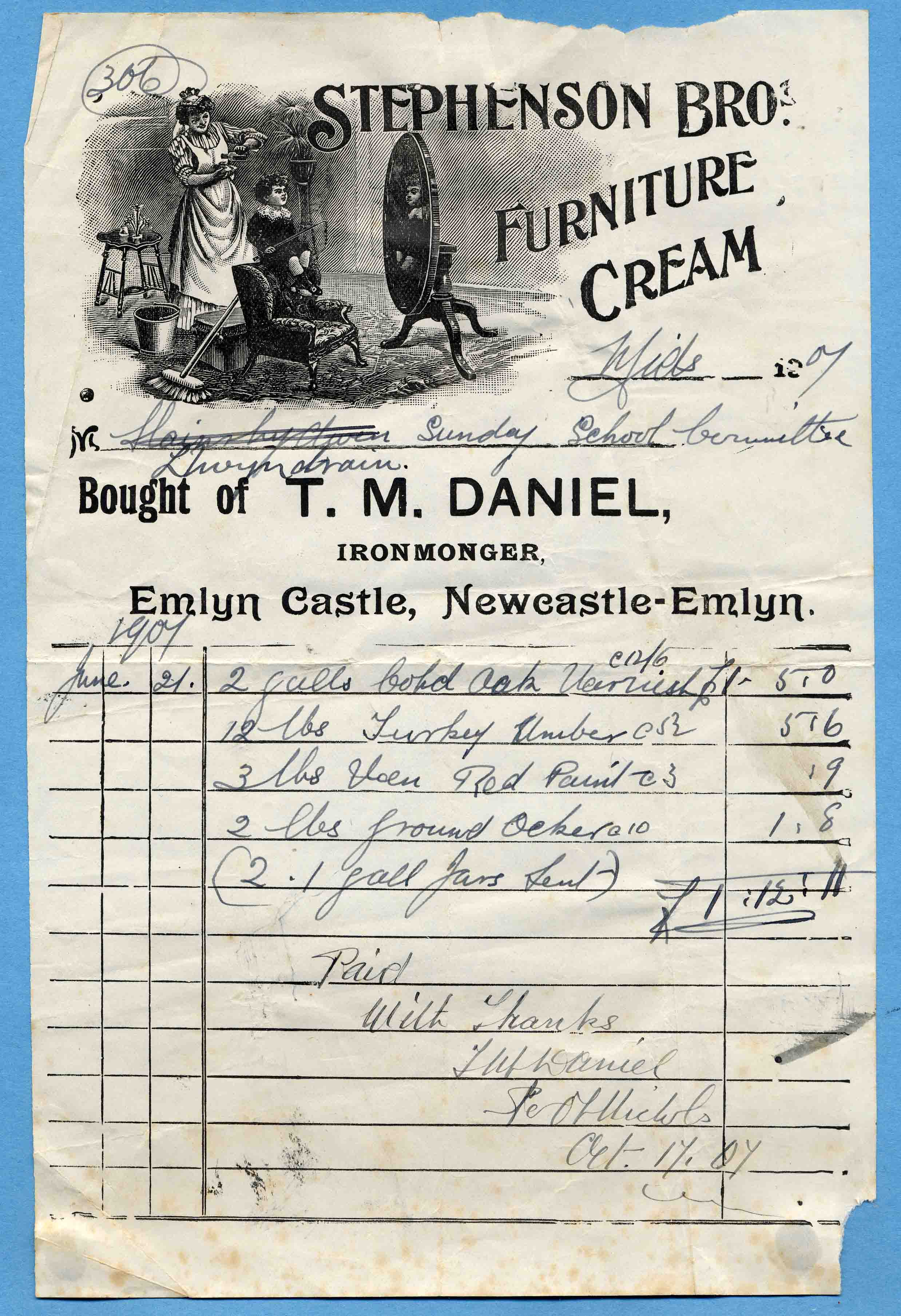 | 1907 | Llwyndrain Sunday School Committee | T. M. Daniel, Ironmonger, Newcastle-Emlyn |