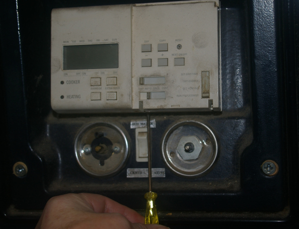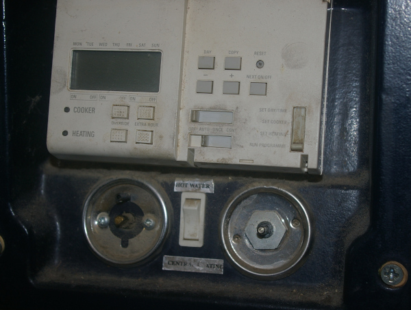 This shows the old controller with its associated controls for the boiler and oven temperatures, and the selector switch which alters the heating between "central heating" and "hot water only" modes. If your controller and / or controls are different to this then this page may not be of use. The new controller should come with these Installation Instructions. You should read them alongside this guide. |